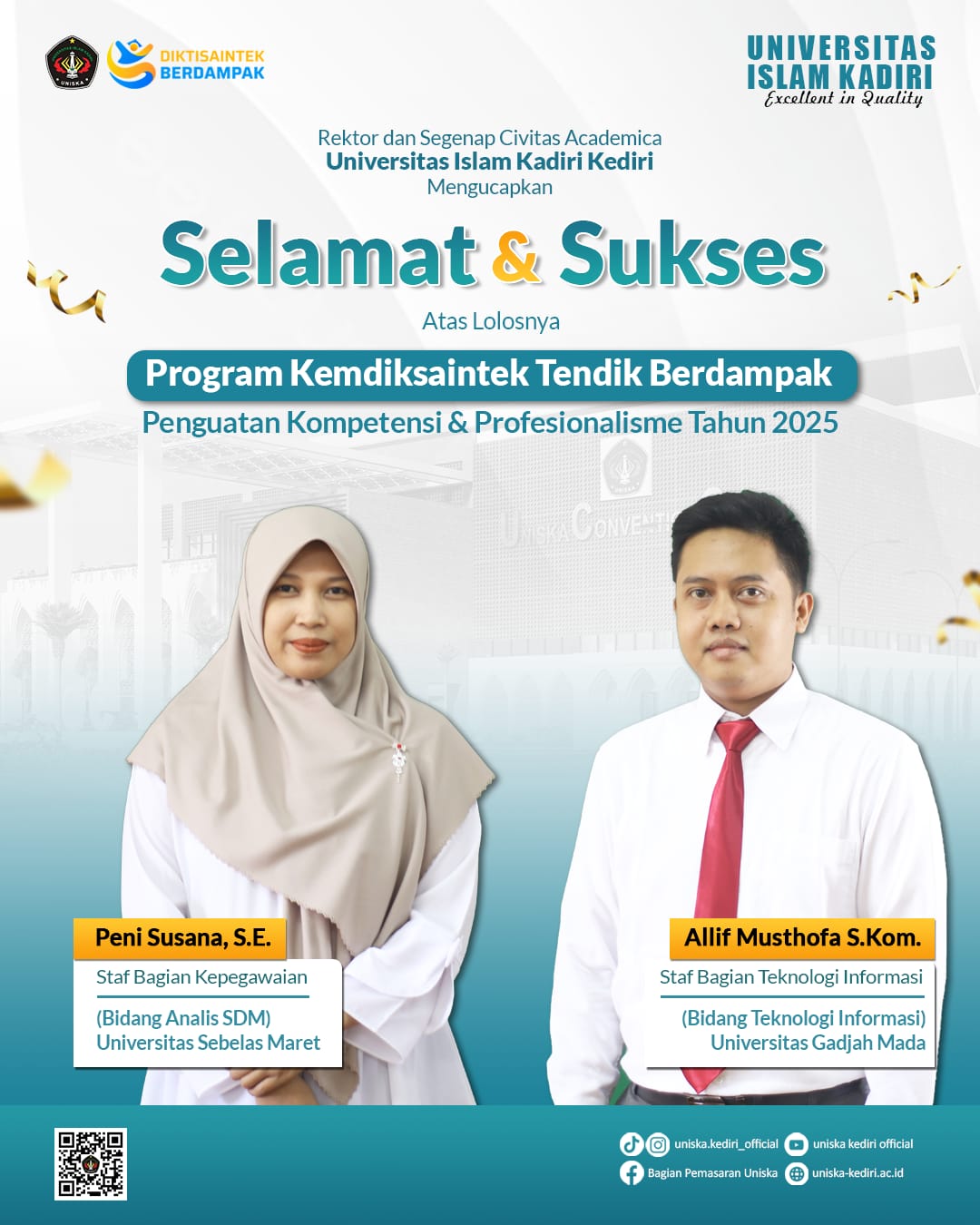 Universitas Islam Kadiri (Uniska Kediri) kembali menunjukkan komitmennya dalam penguatan kualitas sumber daya manusia melalui keterlibatan aktif dalam program nasional. Pada tahun 2025, dua tenaga kependidikan (tendik) Uniska Kediri dinyatakan lolos sebagai peserta Program Kemdiksaintek Tendik Berdampak, sebuah program strategis dari Kementerian Pendidikan Tinggi, Sains, dan Teknologi (Kemdiksaintek) yang berfokus pada peningkatan kompetensi dan profesionalisme tendik perguruan tinggi.