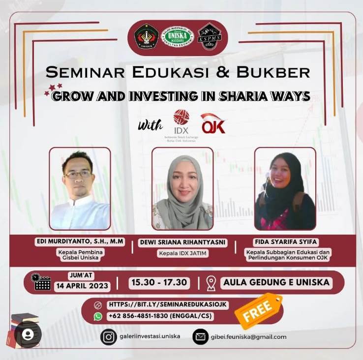 Dalam rangka menyemarakkan Bulan Suci Ramadhan 1444 H, bahwa OJK Kediri bersama GIS BEI UNISKA Kediri bermaksud untuk menyelenggarakan kegiatan Gebyar Safari Ramadhan 1444 H dengan tema “Invest Now, Harvest Tommorow” dengan mengusung tema kegiatan “Grow and Investing in Sharia Ways”.