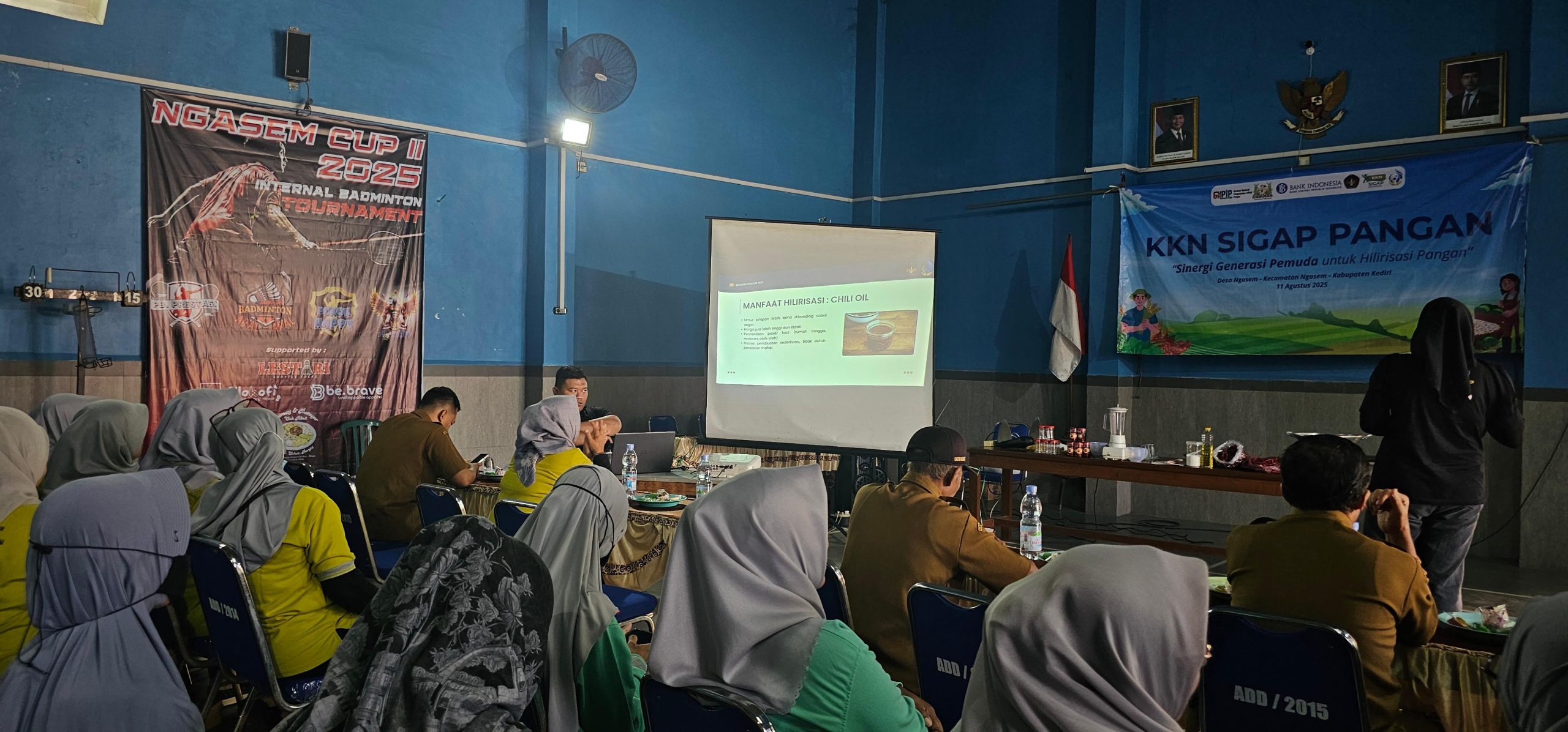 Kediri – Mahasiswa Kuliah Kerja Nyata Tematik (KKN-T) Universitas Islam Kadiri (UNISKA) Kediri yang tergabung dalam program KKN Sigap Pangan menggelar kegiatan bertajuk “Sinergi Generasi Pemuda untuk Hilirisasi Pangan” di Balai Desa Ngasem, Jalan Pamenang pada Senin, 11 Agustus 2025. Program ini memperlihatkan kolaborasi nyata antara mahasiswa, pemerintah desa, dan Bank Indonesia sebagai mitra pendukung. Peserta utama kegiatan adalah ibu-ibu PKK Desa Ngasem yang hadir dengan antusias sejak pagi hingga acara usai.