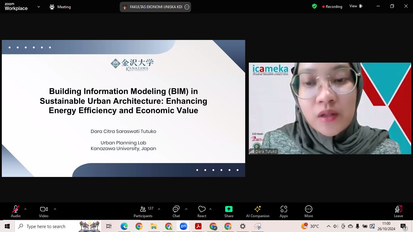 ICAMEKA 2024 juga membahas potensi besar mikroalga sebagai solusi energi ramah lingkungan yang dapat mendukung ekonomi berkelanjutan. Assoc. Prof. Ts. Dr. Nor Sulaiha Yaacob dari Universiti Selangor, Malaysia, menjelaskan bagaimana mikroalga dapat digunakan sebagai sumber energi terbarukan dan bahan baku bioplastik. Selain itu, penggunaan teknologi Building Information Modeling (BIM) dalam arsitektur perkotaan juga diulas untuk menunjukkan bagaimana desain berkelanjutan dapat mengurangi konsumsi energi.