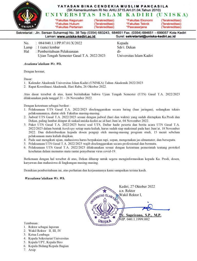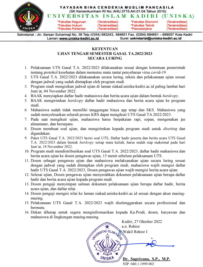 Info UTS Semester Gasal Tahun Akademik 2022-2023 UNISKA Kediri November 18, 2022 Posted by: Author Humas UNISKA Kediri Category: Akademik Komentar Dinonaktifkan pada Info UTS Semester Gasal Tahun Akademik 2022-2023 UNISKA Kediri Berikut kami sampaikan Info UTS Semester Gasal Tahun Akademik 2022-2023 UNISKA Kediri : Bagikan dengan :