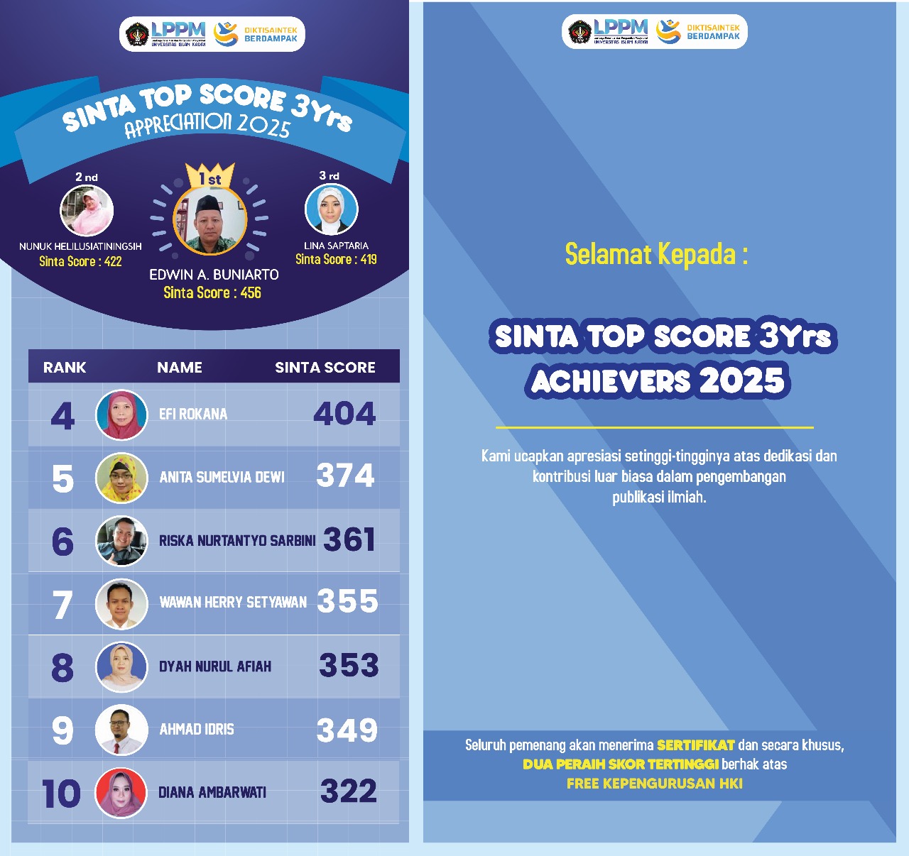 Lembaga Penelitian dan Pengabdian kepada Masyarakat (LPPM) Universitas Islam Kadiri (Uniska) Kediri memberikan apresiasi kepada sepuluh dosen berprestasi melalui ajang SINTA Top Score 3 Years Appreciation 2025 sebagai bentuk penghargaan atas dedikasi dan kontribusi luar biasa dalam pengembangan publikasi ilmiah.