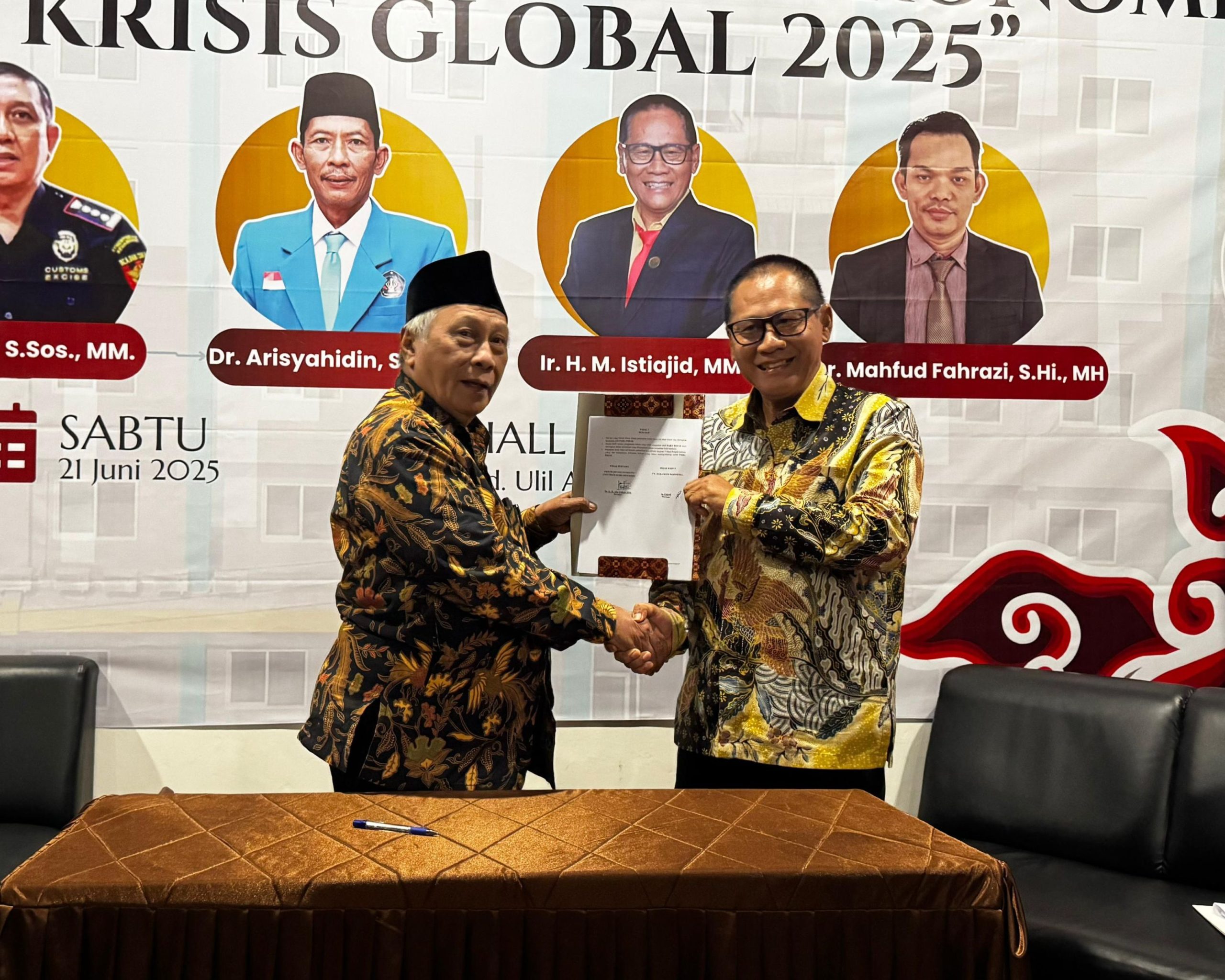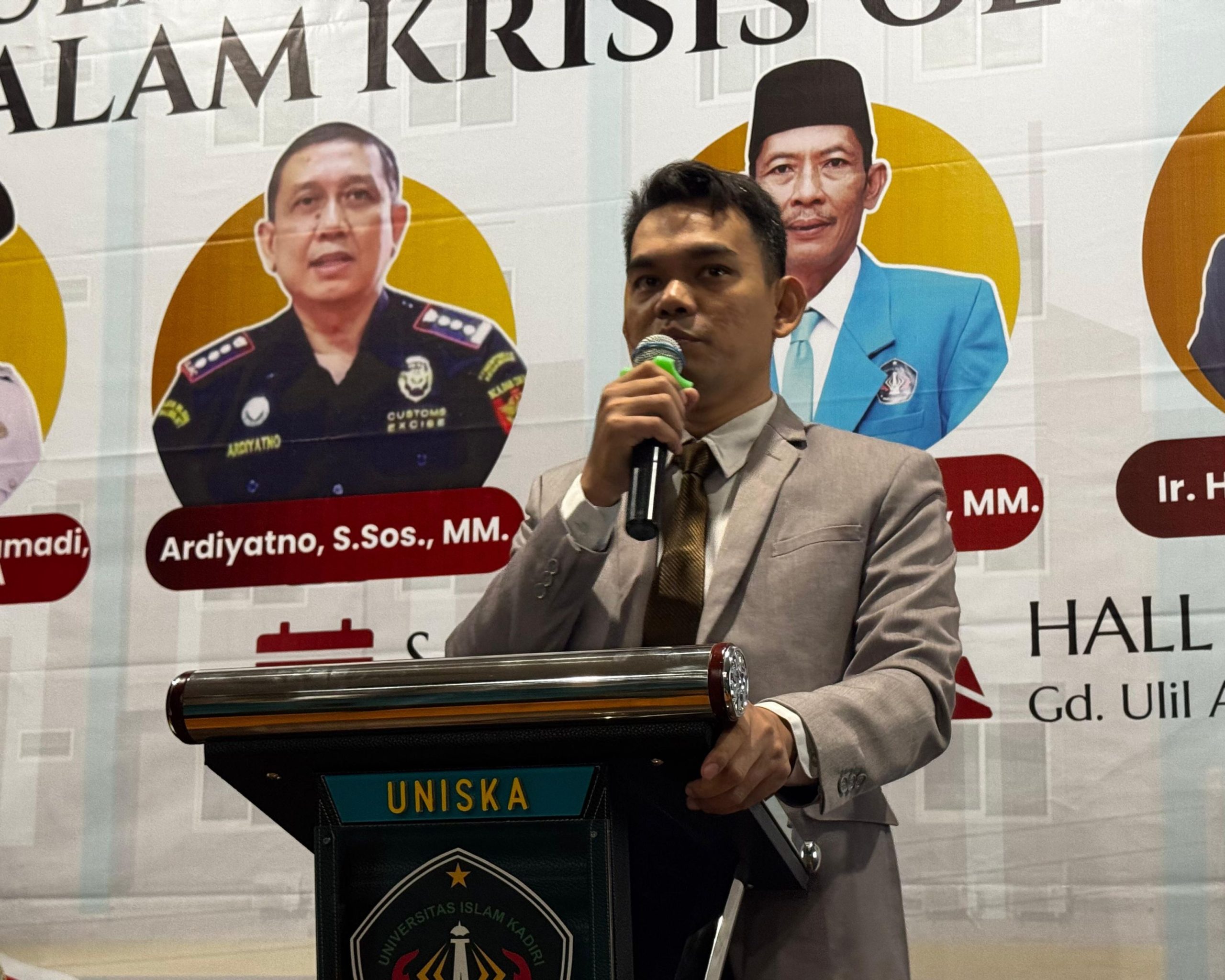 Sesi berikutnya menghadirkan tiga pembicara utama dari sektor swasta, kepabeanan, dan akademisi. Ir. H. Istiajid, MM, Direktur Marketing CV Aura Seed Indonesia, mengulas peran industri benih dalam menjaga ketahanan pangan. Dilanjutkan oleh Ardiyatno, S.Sos., MM, Kepala Kantor Bea dan Cukai Tipe Madya Cukai Kediri, yang membahas “Peran Cukai dalam Mendukung Pemulihan Ekonomi Nasional.” Sementara itu, Dr. Mahfud Fahrazi, S.Hi., MH, Dosen Hukum Internasional Pascasarjana UNISKA, memantik diskusi dengan paparannya yang kritis berjudul “Trumponomics dalam Perspektif Hukum Dagang Internasional dan Pengaruhnya terhadap Kebijakan Hukum di Indonesia.” Ia menyampaikan bahwa dinamika ekonomi-politik global harus dicermati secara cermat agar tidak merugikan kedaulatan hukum nasional.