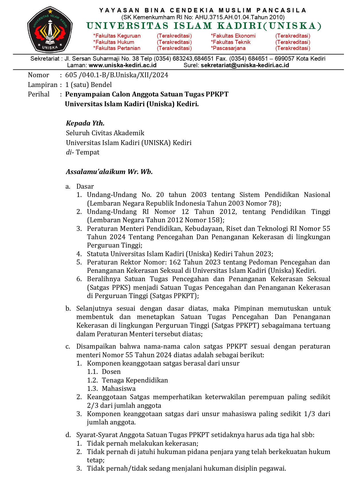 Penyampaian Calon Anggota Satuan Tugas PPKPT Universitas Islam Kadiri Desember 5, 2024 Posted by: Author Humas UNISKA Kediri Category: Berita Komentar Dinonaktifkan pada Penyampaian Calon Anggota Satuan Tugas PPKPT Universitas Islam Kadiri Bagikan dengan :