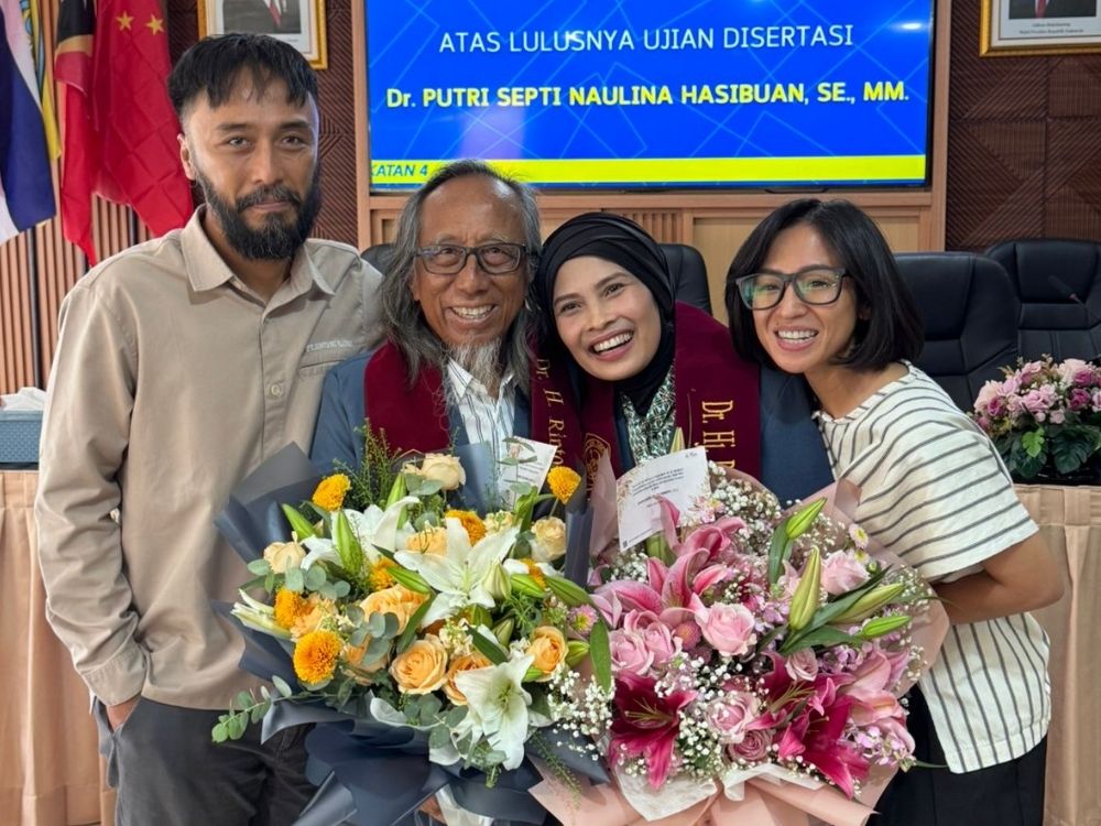 Usai sidang, keduanya tak hanya menerima ucapan selamat dari keluarga dan kolega, tetapi juga banyak diminta membagikan semangat dan pesan inspiratif untuk para pejuang S3 lainnya. Dr. Rinto menekankan pentingnya menyelesaikan studi dengan segera, terutama bagi generasi muda. “Momentum ini jadi pelajaran bagi kita semua, terutama dosen-dosen muda Uniska yang lagi S3, segera selesaikan. Karena di depan tugas besar menanti,” tuturnya. Sementara Dr. Putri, dengan gaya khasnya yang tegas dan penuh semangat, menyampaikan, “Maju terus pantang mundur. Serang! Sampai menang!”