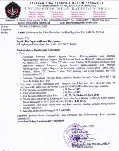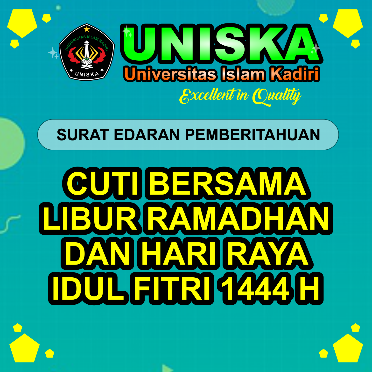 Surat Edaran Pemberitahuan Cuti Bersama, Libur Ramadhan dan Hari Raya Idul Fitri 1444 H Uniska Kediri April 14, 2023 Posted by: Author Humas UNISKA Kediri Category: Pengumuman Komentar Dinonaktifkan pada Surat Edaran Pemberitahuan Cuti Bersama, Libur Ramadhan dan Hari Raya Idul Fitri 1444 H Uniska Kediri Bagikan dengan :