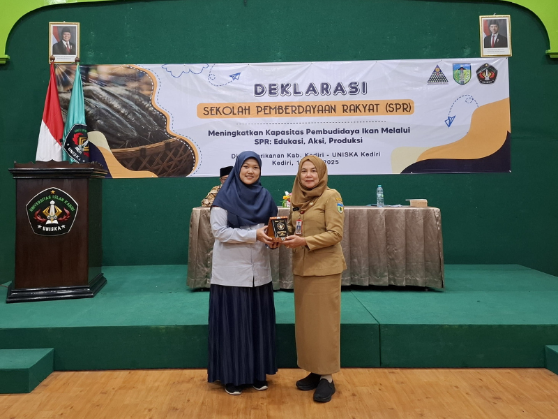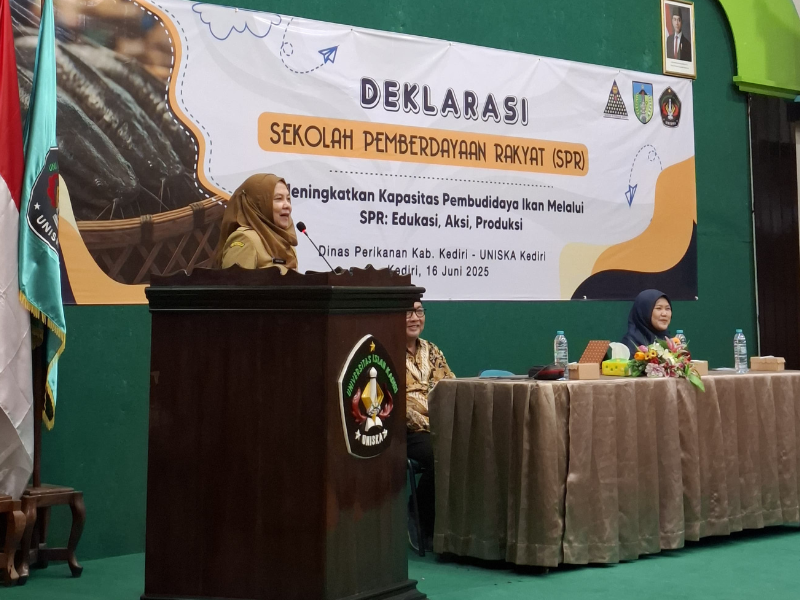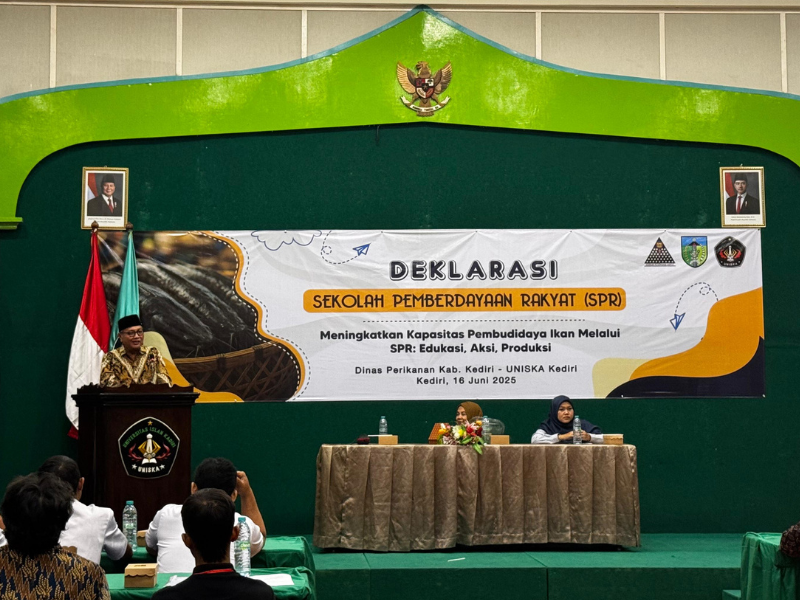 Universitas Islam Kadiri (UNISKA) Kediri bersama Dinas Perikanan Kabupaten Kediri secara resmi mendeklarasikan pembukaan Sekolah Pemberdayaan Rakyat (SPR) bagi para pembudidaya perikanan. Kegiatan yang berlangsung Senin, 16 Juni 2025 di Aula Gedung E lantai II UNISKA ini mengusung tema “Meningkatkan Kapasitas Pembudidaya Ikan melalui SPR: Edukasi, Aksi, Produksi”. Sebanyak 90 pembudidaya dari tiga kecamatan di Kabupaten Kediri yaitu Wates, Banyaan, dan Pare mengikuti program ini sebagai bagian dari upaya membangun ketahanan pangan melalui pendidikan dan kolaborasi lintas sektor. Dari setiap kecamatan diwakili 30 peserta yang terdiri atas 9 wali (DPPI, Dewan Perwakilan Pembudidaya Ikan) dan 21 anggota.