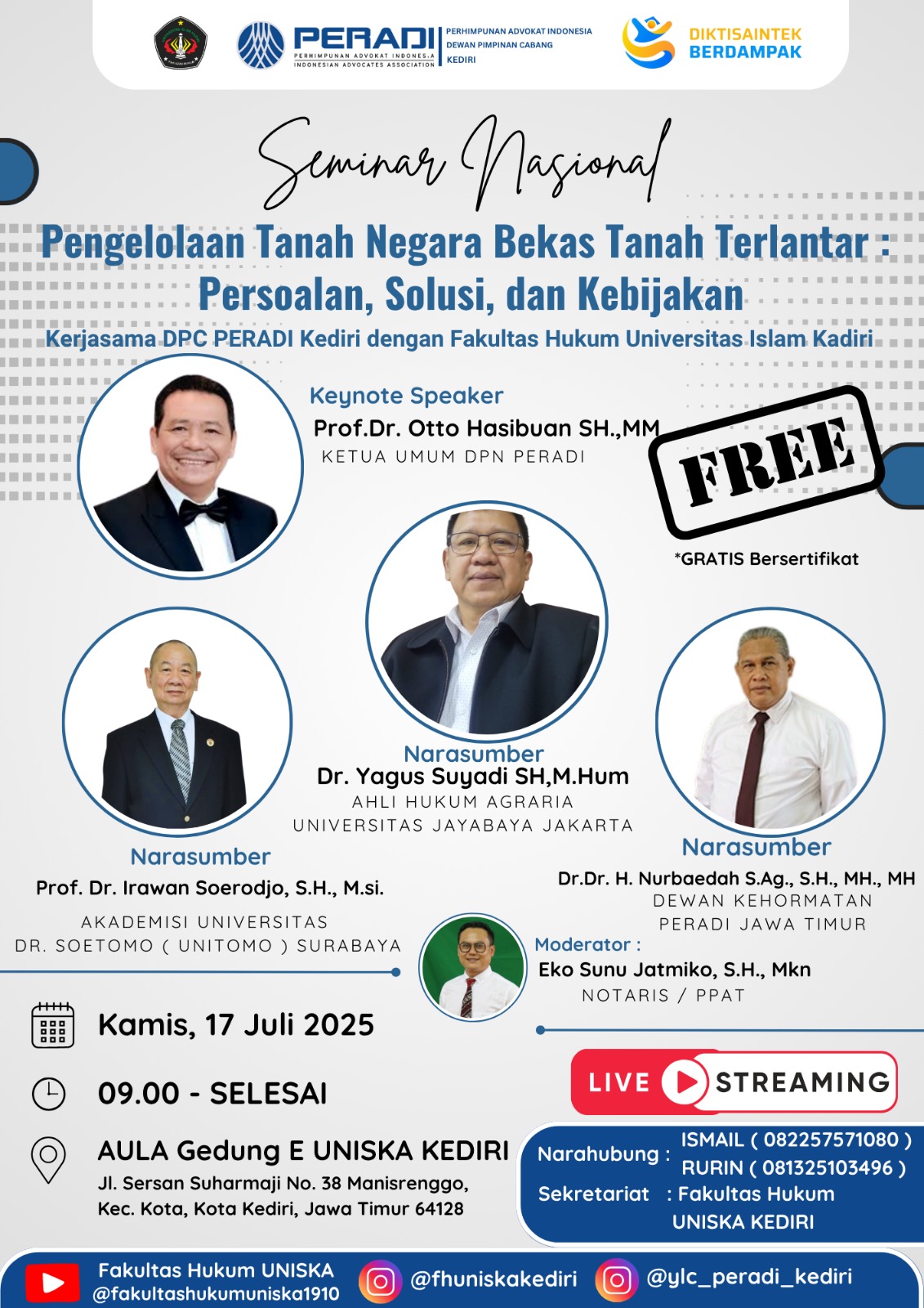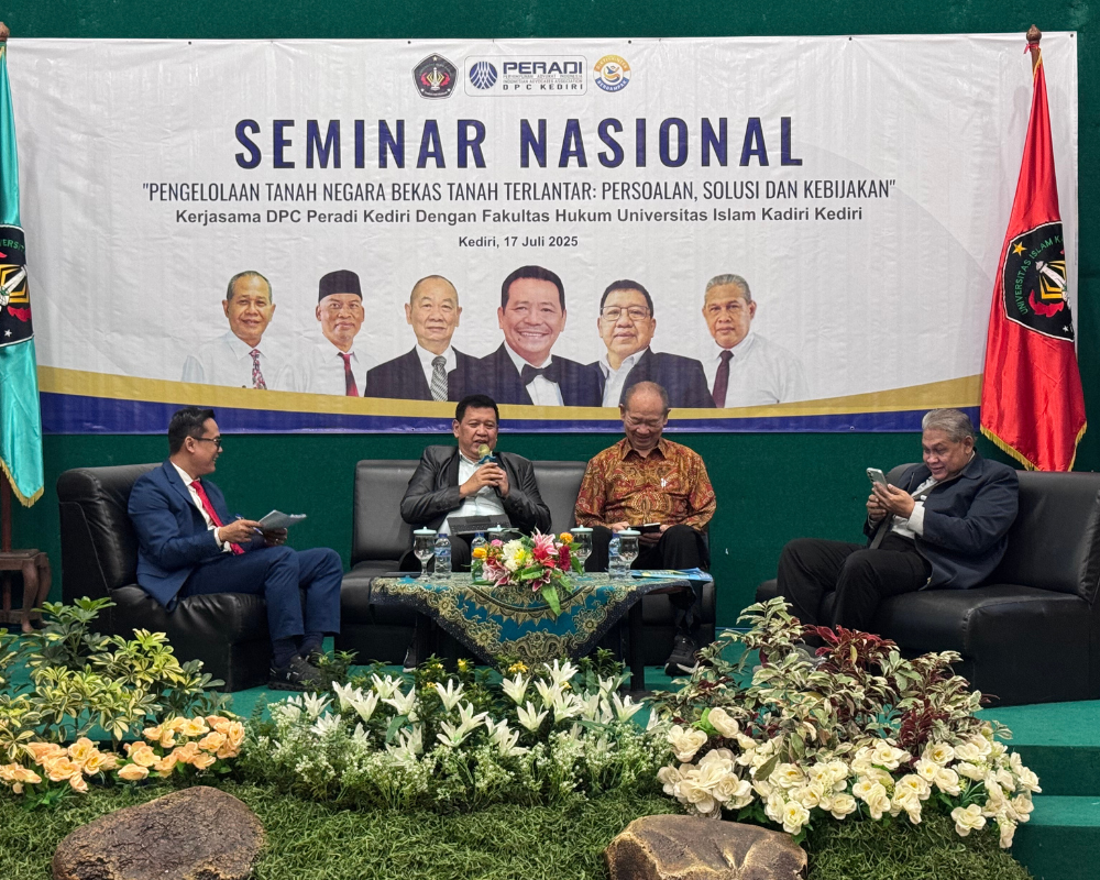 Fakultas Hukum Universitas Islam Kadiri (Uniska) bekerja sama dengan Perhimpunan Advokat Indonesia (PERADI) menyelenggarakan Seminar Nasional bertajuk “Pengelolaan Tanah Negara Bekas Tanah Terlantar” pada Kamis, 17 Juli 2025, bertempat di Aula Gedung E Uniska Kediri. Acara ini dihadiri berbagai pemangku kepentingan, mulai dari akademisi, praktisi hukum, notaris, advokat, mahasiswa, hingga aparatur kelurahan dan kecamatan di wilayah Kediri dan sekitarnya.