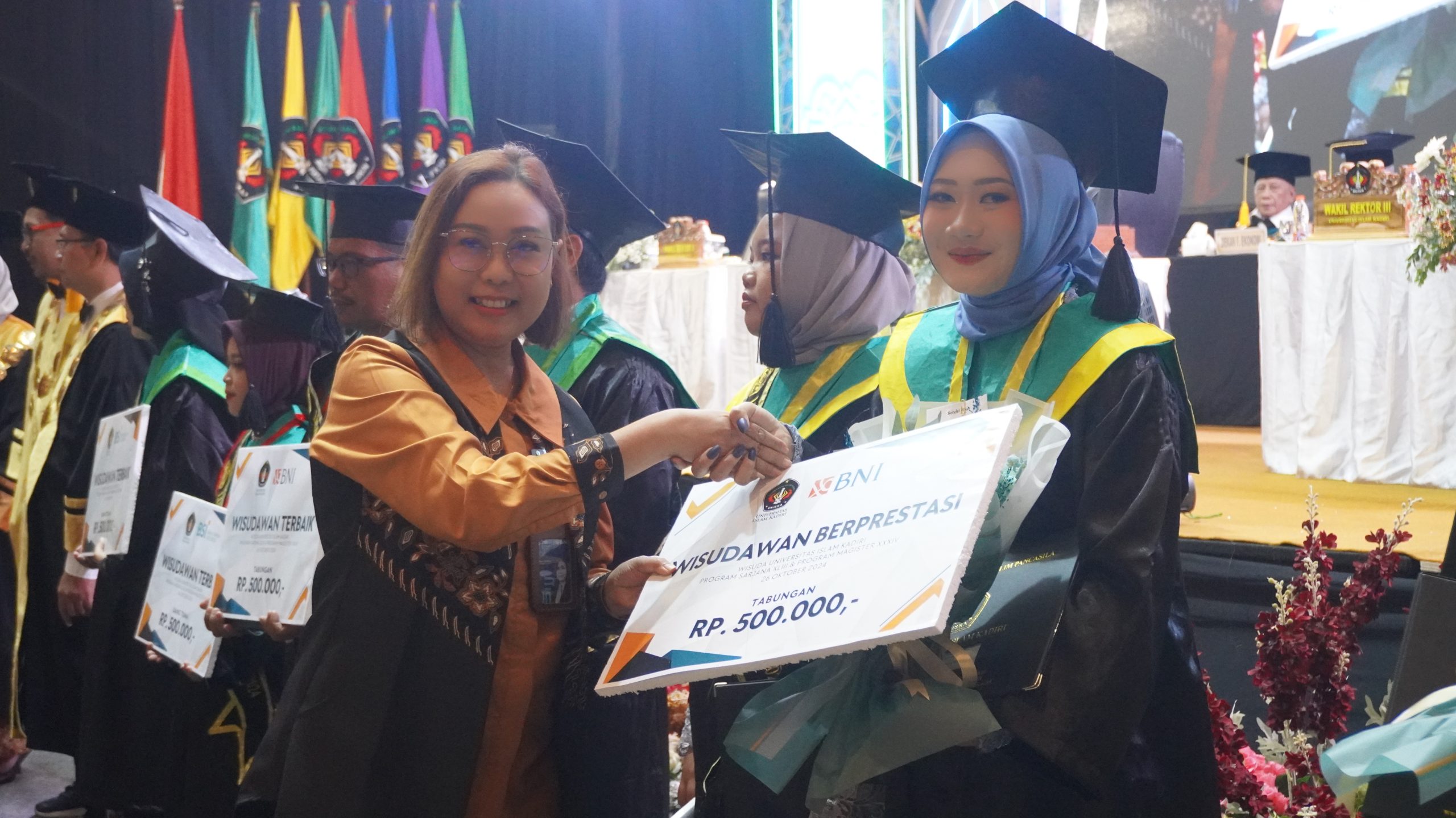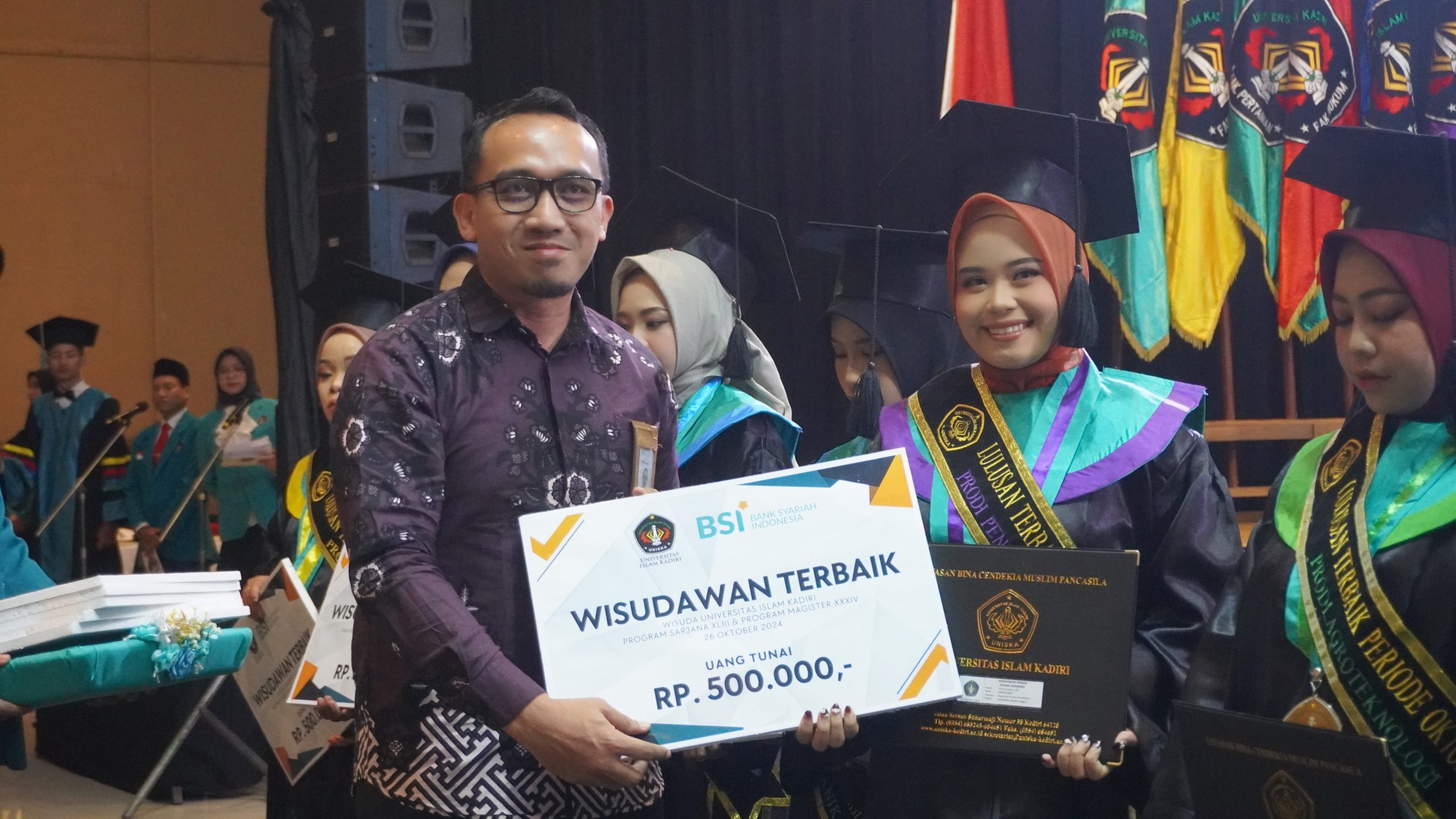 Pada momen wisuda kali ini, para wisudawan berprestasi juga menerima bingkisan dari Uniska Kediri dan uang pembinaan dari bank mitra Uniska yaitu Bank Syariah Indonesia, BNI 46, dan Bank Jatim Syariah. Izzatul Layla, wisudawan terbaik dari FKIP/Program Studi Pendidikan Bahasa Inggris, mengatakan bahwa Ia berterima kasih atas uang pembinan yang ia dapat. “Saya sangat berterima kasih untuk hadiah uang tunai. Uang ini akan saya pakai untuk mengikuti kursus Bahasa Inggris. Saya ingin terus meningkat English skill saya,” ungkapnya.