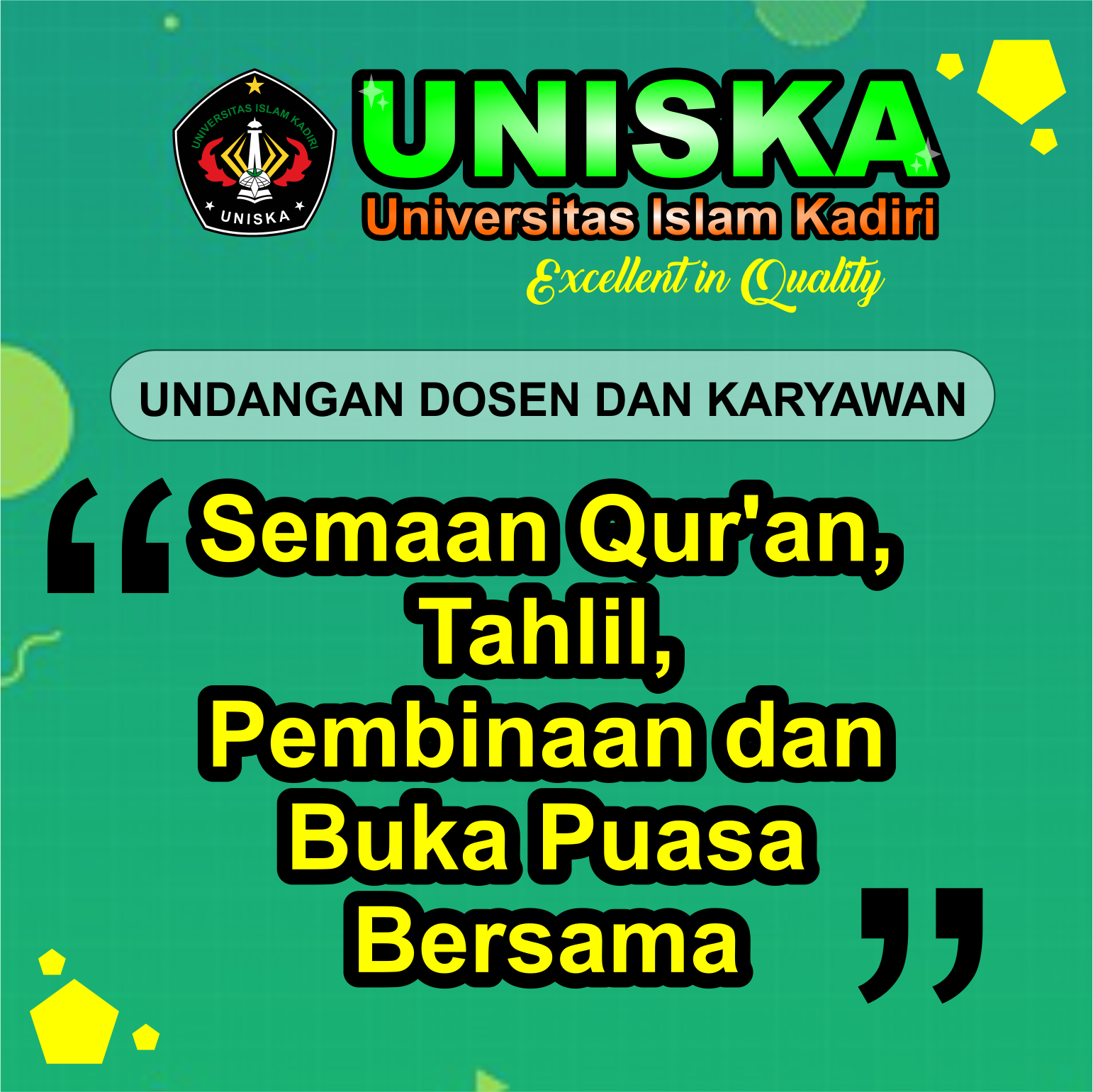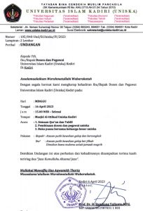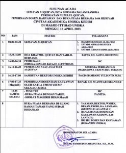 Uniska Kediri mengundang dosen dan karyawan Uniska untuk Mengikuti Semaan Qur’an, Pembinaan dan Buka Puasa Bersama April 13, 2023 Posted by: Author Humas UNISKA Kediri Category: Berita Komentar Dinonaktifkan pada Uniska Kediri mengundang dosen dan karyawan Uniska untuk Mengikuti Semaan Qur’an, Pembinaan dan Buka Puasa Bersama Uniska Kediri mengundang dosen dan karyawan Uniska untuk Mengikuti Semaan Qur’an dan Tahlil, Pembinaan dan Buka Puasa Bersama Ket Gambar : UNDANGAN Ket Gambar : SUSUNAN ACARA Bagikan dengan :