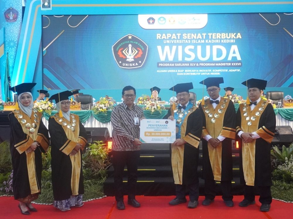 Universitas Islam Kadiri (Uniska) Kediri menerima Beasiswa BSI Maslahat dari Bank Syariah Indonesia (BSI) Kantor Cabang Kediri Hassanudin pada rangkaian Wisuda Sarjana dan Pascasarjana Uniska Kediri ke-45 hari kedua. Penyerahan beasiswa dilaksanakan di Simpang Lima Gumul (SLG) Convention Hall, Minggu (30/11/2025).