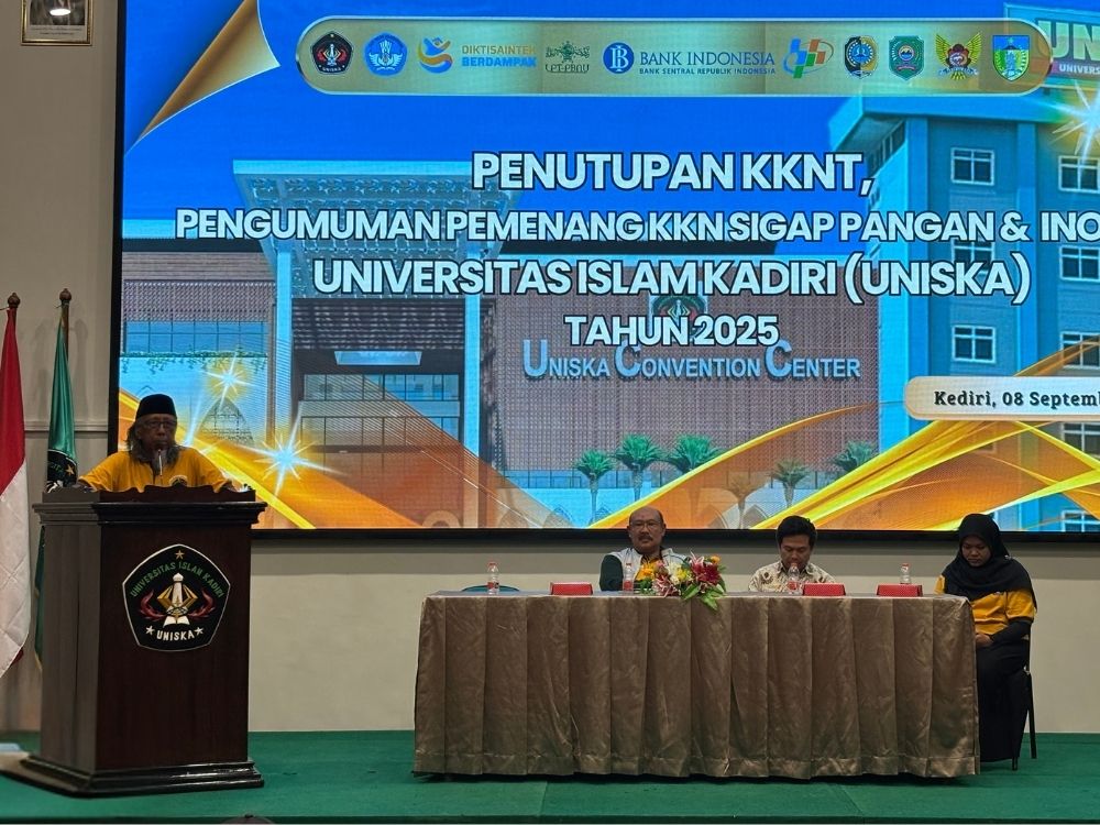 Universitas Islam Kadiri (Uniska) Kediri menggelar acara Penutupan Kuliah Kerja Nyata Tematik (KKNT) 2025. Pada Senin, 8 September 2025, acara berlangsung sejak pukul 13.00 WIB di Aula Gedung E Uniska Kediri, menghadirkan suasana penuh semangat dan kebanggaan. Tidak hanya menjadi penutup kegiatan KKN mahasiswa, momentum ini juga dirangkaikan dengan dua agenda penting yaitu pengumuman pemenang lomba SIGAP Pangan yang digagas bersama Bank Indonesia Kediri, serta INOTEK 2025 yang diinisiasi Lembaga Penelitian dan Pengabdian kepada Masyarakat (LPPM) Uniska Kediri.